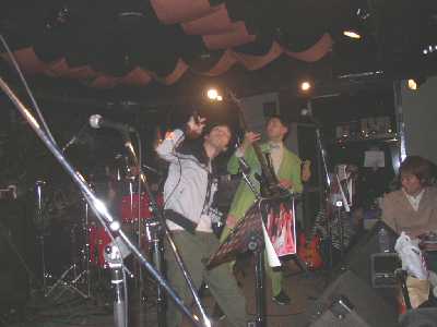 | 舞台人、お客様と一緒になって三次会の「お茶漬け屋さん」に向かう。総勢15名、一足先に来たHoneyFlashのボス殿&杏奈様が焼酎「たんたかたん」を入れて置いていってくれている(おおきに!!)。みんなで乾杯!!! おひつご飯をよそいながら、緑茶&ほうじ茶で暫し「日本人」を痛感しつつ、お漬物でついビールが進んでしまう。ビーフシチューも美味なり!! ああっやっと落ち着いて食事が出来る。Sin@ぼじお殿は無言でひたすら食している。 四次会は10名になり、京都の有名なROCK Bar「治外法権」へ向かう。マスターが顔を見るなり「如何でしたか?」と語りかけるが、ほとんど壊れかけの皆の様子を見て苦笑い…。「ナイトキャップ」が配られた所でまたもや乾杯。程なくリクエストの「黒面」がアナログのパチパチノイズと共に「轟音」で店内に響く。全員の「合唱」がはじまり、みんな完全に壊れていくのが判るが止まらない(笑)。みんなお互いが狂っているのが面白く、さらに狂っていくのが楽しい(あぃむ強引すらいとりぃまっどぉ〜)。アルコール、ドーパミン、アドレナリン、絶叫、ヘッドバンギングなんでもござれの宴が終るとJunGreenの実家にタクシーで移動、全員撃沈、爆睡する。が、ここでなんとJunGreenと一つの布団で寝た方が居ましたが、はたして誰でせう??? |