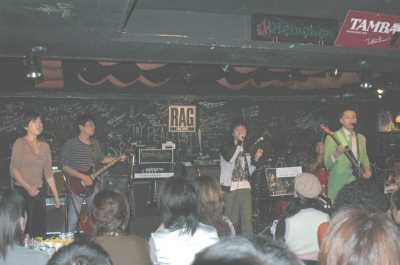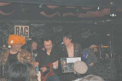 | そして怒涛の 「Final Session」は「Tie Your Mother Down」から、むらっち殿(Dr)+大石社長(B)の若手リズム隊にボス殿(Gtr) +忍者様(Gtr)の2本のオヤヂ(笑)Gtrが乗るが、ボス殿はリハ不参加の為ぶっつけ本番、忍者様曰く「正にハニフラセッション in RAG!!」どすわ〜。ボス殿がイントロを弾き出すが、何時の間にかラリルレ殿も舞台で軽く絡んでいる(^^) 1番はムスターファ・サモキュリーが「普通服にヅラ」で登場!! マイクスタンドを客席へ差出してサビを煽る熱演。2番は名古屋コンベンションで満場のウケをとったまっつが「名古屋そのままのネタ」で「ヅラ+My特赤(卓球ラケット)」で歌う。続くGtrSoloではステージ後方の遠慮気味なボス殿を「皮ジャン」はじめちゃんが舞台中央に引き摺りだし、客のテーブルから拝借したビール缶でボス殿がスライドGtrのSoloを決める!! さすが「キッチンギタリスト(Jun Green命名!!)」。ボス殿が舞台中央から退くと同時に、手元のマイクを掴んだはじめちゃんが渋く3番を歌い込み(でも何時の間にかまた脱いでいる…)、あれ、良く観るとラリルレ殿もリフ弾いているよ〜ん(笑)、ギタリストパワーを魅せ付けたSessionになりました、みんなおおきに!!。 |