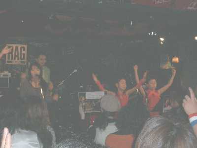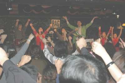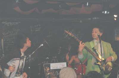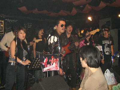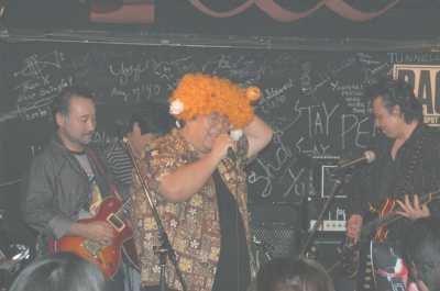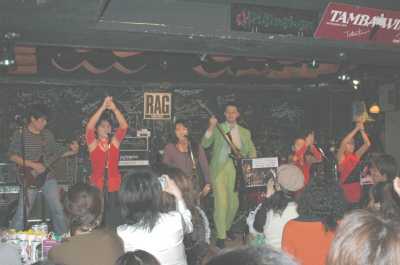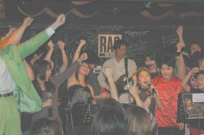 | そして怒涛の 「Final Session」は「Tie Your Mother Down」から、むらっち殿(Dr)+大石社長(B)の若手リズム隊にボス殿(Gtr) +忍者様(Gtr)の2本のオヤヂ(笑)Gtrが乗るが、ボス殿はリハ不参加の為ぶっつけ本番、忍者様曰く「正にハニフラセッション in RAG!!」どすわ〜。ボス殿がイントロを弾き出すが、何時の間にかラリルレ殿も舞台で軽く絡んでいる(^^) 1番はムスターファ・サモキュリーが「普通服にヅラ」で登場!! マイクスタンドを客席へ差出してサビを煽る熱演。2番は名古屋コンベンションで満場のウケをとったまっつが「名古屋そのままのネタ」で「ヅラ+My特赤(卓球ラケット)」で歌う。続くGtrSoloではステージ後方の遠慮気味なボス殿を「皮ジャン」はじめちゃんが舞台中央に引き摺りだし、客のテーブルから拝借したビール缶でボス殿がスライドGtrのSoloを決める!! さすが「キッチンギタリスト(Jun Green命名!!)」。ボス殿が舞台中央から退くと同時に、手元のマイクを掴んだはじめちゃんが渋く3番を歌い込み(でも何時の間にかまた脱いでいる…)、あれ、良く観るとラリルレ殿もリフ弾いているよ〜ん(笑)、ギタリストパワーを魅せ付けたSessionになりました、みんなおおきに!!。 |