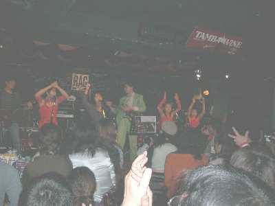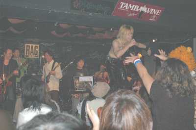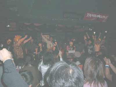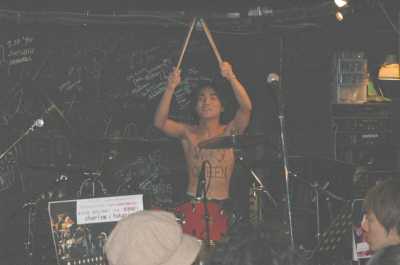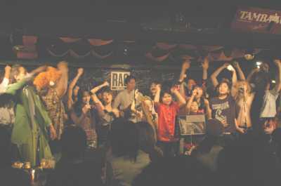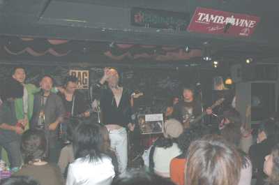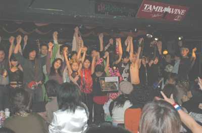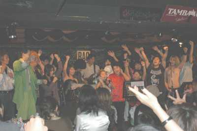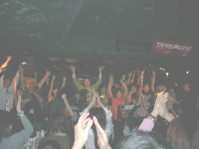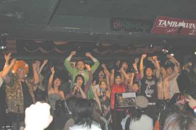 | 舞台人、お客様と一緒になって三次会の「お茶漬け屋さん」に向かう。総勢15名、一足先に来たHoneyFlashのボス殿&杏奈様が焼酎「たんたかたん」を入れて置いていってくれている(おおきに!!)。みんなで乾杯!!! おひつご飯をよそいながら、緑茶&ほうじ茶で暫し「日本人」を痛感しつつ、お漬物でついビールが進んでしまう。ビーフシチューも美味なり!! ああっやっと落ち着いて食事が出来る。Sin@ぼじお殿は無言でひたすら食している。 四次会は10名になり、京都の有名なROCK Bar「治外法権」へ向かう。マスターが顔を見るなり「如何でしたか?」と語りかけるが、ほとんど壊れかけの皆の様子を見て苦笑い…。「ナイトキャップ」が配られた所でまたもや乾杯。程なくリクエストの「黒面」がアナログのパチパチノイズと共に「轟音」で店内に響く。全員の「合唱」がはじまり、みんな完全に壊れていくのが判るが止まらない(笑)。みんなお互いが狂っているのが面白く、さらに狂っていくのが楽しい(あぃむ強引すらいとりぃまっどぉ〜)。アルコール、ドーパミン、アドレナリン、絶叫、ヘッドバンギングなんでもござれの宴が終るとJunGreenの実家にタクシーで移動、全員撃沈、爆睡する。が、ここでなんとJunGreenと一つの布団で寝た方が居ましたが、はたして誰でせう??? |