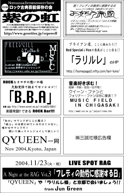 | 今年(2004年)で3回目を迎えたFreddie Mercury & Queen Tribute Live、幹事兼用務員兼司会(本人談)のJun Greenさんによる、お馴染みのレポートを楽しんで頂けたことと思います。僕個人としてはプレイヤーとして参加するのは二度目、Junさんのレポートにもあるように、今年は人前で演奏する機会が多かったせいか、余裕を持ってステージに上がれたような(笑) ま、それはさておき、このイベントを仕切ったJunさん、本当にお疲れさまでした&ありがとうございました。去年も記しましたが、貴方の熱意・人脈なくして決して成功はあり得なかったでしょう。既に来年の企画も進んでいるという噂もあり、このイベントが初冬の京都の風物詩になる事を願ってやみません。 そして、RAG殿、KORG殿、BBA殿にも深く感謝致します。 振り返ってみますと、Junさんのレポートの冒頭にもあります通り、2004年は時ならぬ(?)クイーン・ブームで幕を開けました。すっかりそれに乗ってクイーン関連のブツを買い漁り、いくつかのイベントに顔を出してしまった自分も情けないですが(爆)おかけで自身のクイーンに対する想いを再認識し、また大勢の人と新たに知り合いになれました。クイーンに感謝、というか、あちこちに引っ張りだしてくれたJunさんに感謝というべきか(笑) 実際、Junさんが解雇もとい回顧されている今年のイベントのほとんどに自分も同席していた、というのが凄いというか何というか...(苦笑) いい経験をさせて貰いました。 いい経験といえば、RAGにお越し頂いた方はお気づきになられたでしょうか? 会場で配られたKORG殿のVOXアンプの裏に、どさくさに紛れて協賛広告を掲載させて頂きました。初めての体験です。ご覧になっていない方の為に、ここに公開致します。重いですけど(笑)↓です |