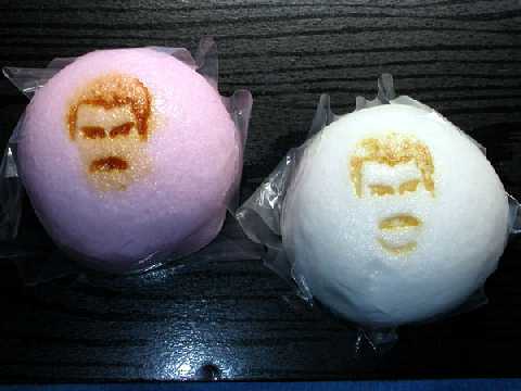 | さて、今回ある意味でもう一つの目玉だったのが、「フレ饅」でしょう。当初は出演するはずだったよっしぃーさんが、京都の老舗和菓子屋に勤める和菓子職人である事から、なぜか話が進み、イベント記念としてフレディの顔を焼き付けた紅白饅頭を作る事になったのです。ま、肖像権とか何とかややこしい話も絡んでくるのでしょうが(笑)、ここはひとつ大目に見てやって下さい。で、その「フレ饅」が↓です。こっちも撮影は忍者さんです。 |